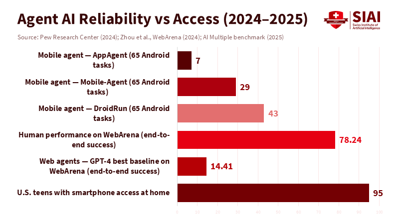 School leaders should pay attention to a clear contrast: nearly all teens have a smartphone, but agent AI still struggles with multi-step, real-world tasks. In 2024 surveys, 95% of U.S. teens reported having access to a smartphone at home. This infrastructure far outstrips any other learning technology. Meanwhile, cutting-edge web agents based on GPT-4 only completed about 14% of complex tasks in realistic website environments. Recent mobile benchmarks show some improvement, but even the most powerful phone agents completed fewer than half of 65 fundamental functions. This gap between universal access and uneven performance highlights a policy issue in education. Schools feel pressure to provide constant, on-device help, but agent AI can’t be counted on for unsupervised student use. The solution isn’t to ban or to buy these tools unthinkingly. Schools should require proof of reliability in controlled environments, publish the results, and expand use only when solid evidence exists.