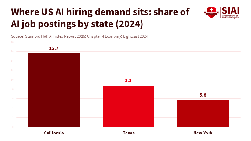 The second issue is geographic. California has the highest AI demand, accounting for 15.7% of U.S. AI job postings in 2024, ahead of Texas at 8.8% and New York at 5.8%. This does not prove that firms will leave. SB 53 targets large developers, and many startups will not be directly affected. However, ecosystems shift. The question is where the next training team is, where the next compliance staff is hired, and where the next capital is invested. If the California AI safety law introduces legal uncertainty into model development, and other states are more relaxed, the easiest path can shift. Over time, this can make “relocation” seem like a steady move.