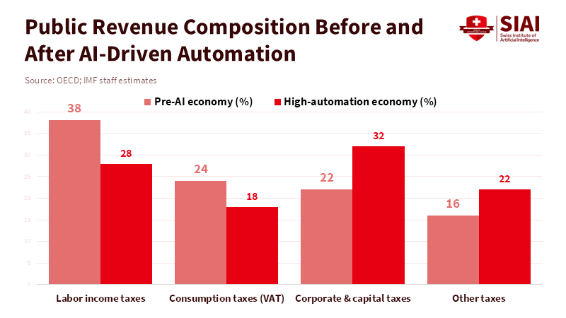 The key idea is quite clear. Modern automation increases the capital used in production and, assuming all other factors remain constant, lowers the share of national income received as wages. When salaries decline, consumer spending tends to fall as well. A sizable share of public revenue in most developed countries comes from taxes on work (payroll taxes and personal income taxes) and consumption taxes like VAT. Because automation reduces both earnings from work and spending, the combined decrease of these bases creates the possibility of long-term deficits if tax systems are not adjusted.