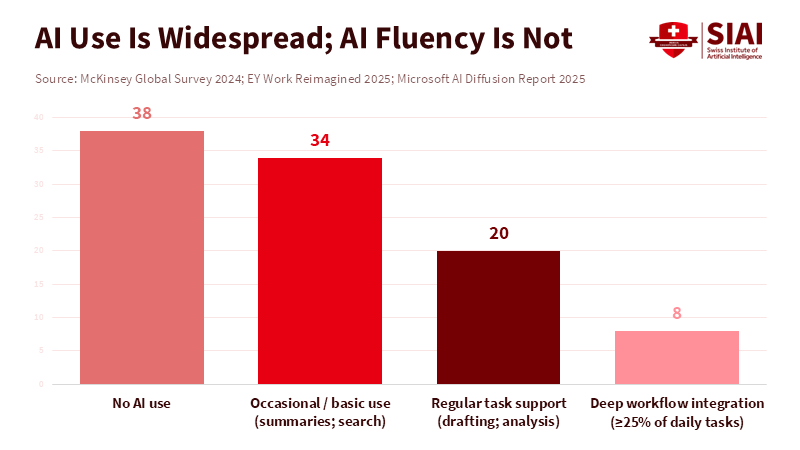 This happens through two related ways. First, AI increases a skilled worker's output in a day. Second, once AI handles routine tasks, the jobs left for people require more judgment, design, and the ability to combine information from different areas. These abilities are easier to practice when one regularly uses AI as a partner. Surveys from large consulting firms and research groups in 2024 and 2025 show a clear gap between the extent to which organizations have adopted AI and the extent to which they use it regularly. Firms report that AI is widely used, but only a few employees say it accounts for a large part of their daily work. In other words, AI is present, but its power lies in the hands of those skilled in using it.