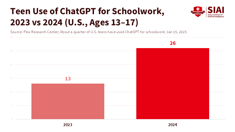 Figure 1: Teen use of ChatGPT for schoolwork doubled in one year, making disclosure and distance-by-default urgent for schools.