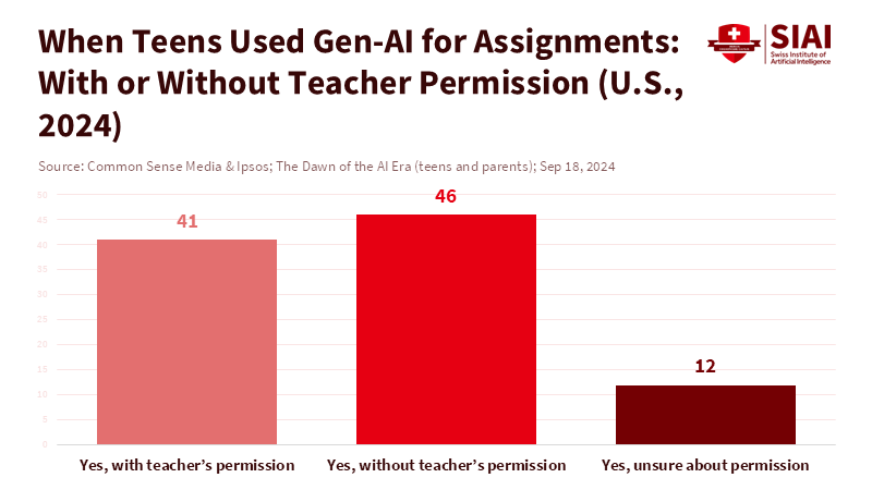 Figure 2: Many teens who use gen-AI for assignments do so without teacher permission, underscoring the need for clear classroom rules and provenance.