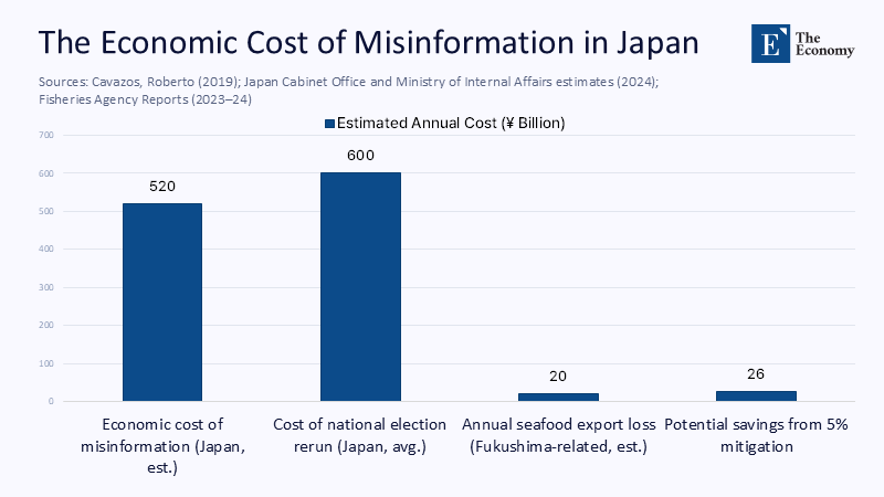 Even conservative assumptions suggest the mesh pays for itself. If Japan pares only 5% of the ¥520 billion estimated annual cost of disinformation, the dividend is about ¥26 billion—a multiple of the verification budget. Seafood export shocks alone show how quickly returns accrue: each month of false radiation rumors costs Tohoku fishermen roughly ¥3.3 billion in lost sales. Curtailing such episodes by a quarter nearly recoups a year of audit costs.