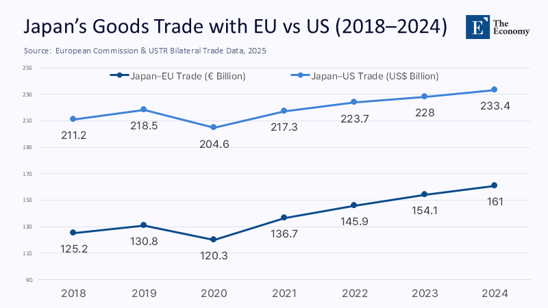 Following World War II, Japan adopted a two-tier strategy: subcontracting military deterrence to the United States while rebuilding its industrial capacity under the protection of a nuclear umbrella. For decades, the formula held, but three structural forces have diluted its sufficiency. First, the Emergency Economic Partnership Agreement (EPA), which entered into force in 2019, has injected momentum into trans-Eurasian commerce, pushing total EU–Japan flows up 20.4% between 2018 and 2023; the average annual growth rate has held at nearly 4% even through pandemic volatility and yen weakness. Second, the US-Japan merchandise trade has matured into a low-growth, debt-funded plateau. In 2024, exports from the United States to Japan increased modestly by 5.4%, while imports from Japan grew by less than 1%, resulting in a structural US deficit of $68.5 billion and sparking recurring tariff discussions in Washington. Third, China's coercive economic statecraft—choking gallium exports in 2023 and rare-earth shipments a decade earlier—has convinced Japanese planners that any single-source dependency is a vulnerability, whether that source is Beijing or the Beltway. Taken together, these currents impel Tokyo to behave less like a client and more like a portfolio balancer whose hedging instrument of choice is Europe. This strategic partnership between Japan and Europe is a cause for optimism in the future of trans-Eurasian commerce.
