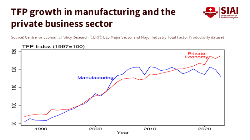 One criticism is that the recent productivity gains are merely cyclical fluctuations. The data do reveal some variability from quarter to quarter. However, the four-quarter increase in manufacturing productivity through Q2 2025 is the strongest since 2021. While this does not confirm a new trend, it contradicts the idea of persistent stagnation. Another critique suggests that the “hidden gains” stem from simply switching from consumer to producer price indexes. Although this concern is valid, the evidence is thorough. The correction compares price measures across similar product categories and adjusts for import content using the BEA input-output tables. The discrepancies are most significant in areas experiencing rapid quality changes, like computers and electronics. When the correction is applied, long-run manufacturing TFP roughly doubles, and the post-2009 period shifts from slightly negative to clearly positive. Although the slowdown persists, the overall level is higher. This is crucial for planning programs and capacity.