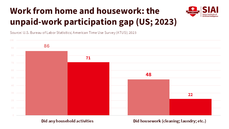 Some say norms will fix themselves as couples become more equal. Progress is being made. However, data still shows differences in routine chores. Women were more likely than men to do housework, such as cleaning or laundry (48% versus 22%). The issue is not that every household is unfair. It is that women still carry the daily jobs that are hard to postpone. Remote work can reduce that gap if it involves men in more routine tasks, but it can also widen it if the person at home becomes the problem-solver. Policy should assume mixed results and provide support to reduce downside risk.