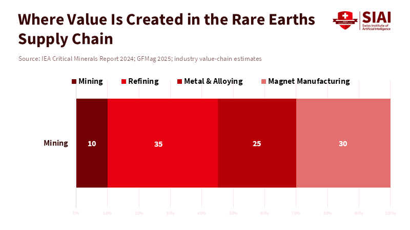 The rare earths supply chain is an extended sequence of specialised activities that accumulate value at successive stages. Mining yields ore; concentration produces mixed oxides; hydrometallurgical separation isolates individual elements. The rare earths supply chain comprises several specialized steps, each adding value. Mining extracts the ore, concentration turns it into mixed oxides, chemical separation isolates each element, metallurgical processes produce metals and alloys, and finally, magnets are manufactured from those metals. Each stage needs different equipment, skills, and rules. Mining is usually straightforward, but chemical separation and control are harder and less common. Most of the profit and control come from finishing the materials, not just extracting them. Because each step depends on the others, a problem in one stage can affect the entire chain. If there isn’t enough separation capacity, mines can’t get full value. If metallurgical capacity is lacking, magnet makers can’t get what they need. This means that diversifying supply is about designing the whole system, not just mining more. Composition, temperature control, and reagent quality. Refineries must also cope with waste streams that include low-level radioactive material, which require robust treatment and secure storage. These realities make refining capital-intensive and operationally demanding. Historically, China accepted these burdens, allowing firms to experiment, scale, and iterate on process improvements. Over time, this produced dense industrial clusters where chemical firms, equipment suppliers, and research institutes co-located. That clustering lowered costs and accelerated learning, creating a cumulative advantage that is difficult to replicate quickly. New refineries in other regions typically face higher initial costs, longer learning curves, and increased political risk because they must demonstrate environmental performance in contexts that may lack deeply experienced regulators.