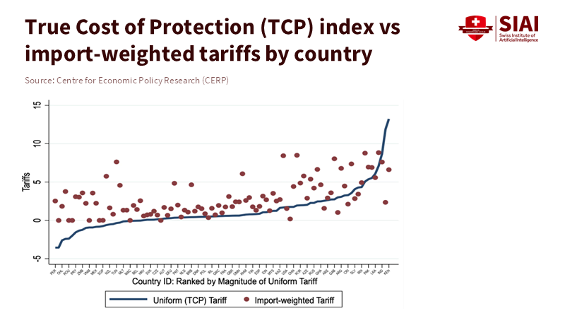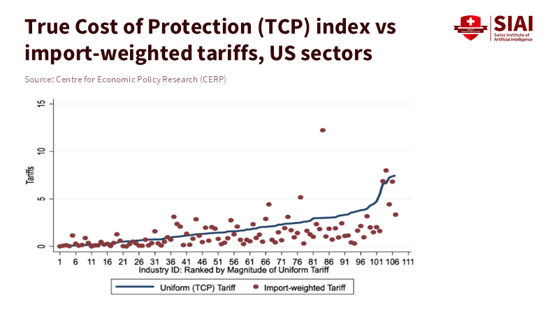 A key reason reciprocal tariffs are often misinterpreted is that they redistribute, not eliminate, trade. When two countries raise mutual barriers, their direct trade falls. But that decline does not disappear into nowhere: trade is diverted. Third-party suppliers—competitors in other regions—tend to capture the freed export shares. That can look like a short-term “win” for some developing exporters, but it is a fragile one. Empirical analysis of past tariff episodes, including the US-China dispute, shows mixed short-run evidence for large-scale diversion: some product groups reallocate quickly to third markets, while many complex intermediate goods retain supply ties to the original producers, at least initially. A systemic escalation of reciprocal tariffs, however, magnifies these effects and creates chains of reallocation that are costly to unwind. The True Cost of Protection idea reframes measurement by accounting for these ripple effects. Rather than measuring tariffs only by the direct import weight on which they are imposed, the True Cost approach weights tariffs by how trade shares shift between buyers and among competing suppliers. This reveals that a tariff’s “true” burden is often higher than conventional import-weighted indexes show, because they miss the indirect costs imposed through trade diversion and global supply-chain interdependence.