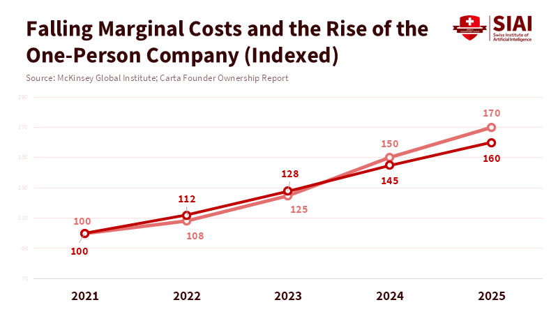 The rise of the one-person company is not just a minor trend; it signals a bigger shift. In 2024, about 35% of new startups on major private-capital platforms had a single founder, up from the teens just a few years ago. However, these solo firms still receive a much smaller share of venture funding. This pattern—more solo startups but less capital per founder—makes sense when the costs of producing and distributing goods and services drop. Lower costs remove the barriers that once required teams and upfront capital. As a result, more solo entrepreneurs are emerging, and the business landscape is changing: small, flexible providers can challenge established companies, niche products can reach global markets, and individuals can use AI, platforms, and outsourcing to increase their impact. This article asks a key policy question: as costs fall, how should regulators, educators, and funders help spread these benefits while preventing new concentrations of power?