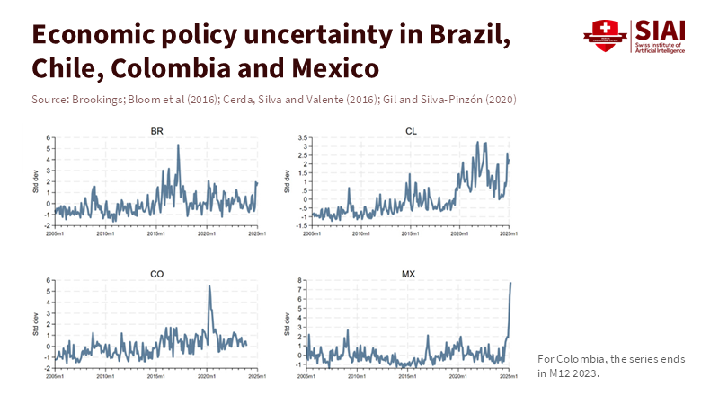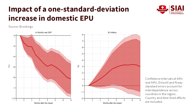 The proof from Latin America is much clearer than it was five years ago. Recent studies show that local economic policy uncertainty creates financial problems right away and, in the medium term, causes output to shrink. Stock markets become unstable, borrowing costs rise, and exchange rates fall soon after a policy surprise. Then, as companies rethink their future earnings, they cut back or cancel investment plans. These problems happen everywhere trade and money connect countries. Latin America is just one example. An analysis of four major Latin American economies shows that local uncertainty shocks behave like supply-side shocks: output falls, and inflation rises, affecting both the financial and real economies. It is the immediate financial reaction, combined with the later drop in real demand, that turns a short-term policy event into a lasting downturn.