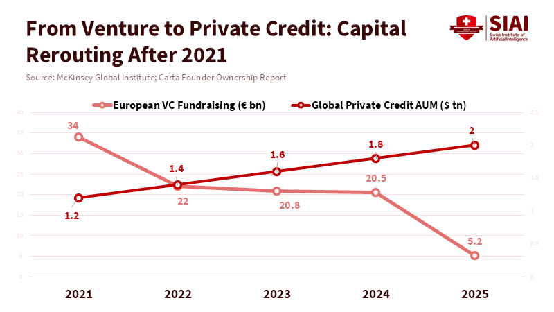 We can see this shift if we look beyond central banks' headlines. Venture capital, a key driver of growth for new businesses, experienced a decline for several years. The number of active venture capital investors and the number of deals they were doing decreased sharply after reaching highs in 2021, especially in Europe, where foreign investors pulled back. Companies that had depended on selling their stakes in later stages found those options were no longer available. Simultaneously, private credit options expanded. Institutional investors put money into direct lending and structured private credit as yields increased and risk premiums in public markets spiked. This wasn't by chance; it was a logical investor response to higher policy rates, stricter bank lending rules, and an uncertain future. The end result is like traditional monetary tightening – less risk-taking and slower credit for innovative companies – but it happened through market changes instead of a single policy announcement.