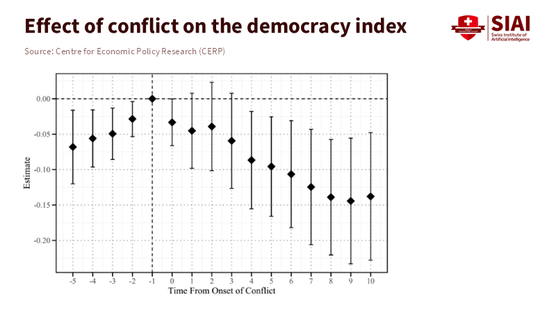 The central claim – that the start of a conflict predicts a multi-year decline in democracy in many cases – is based on comparing countries that went to war with similar countries that did not. These analyses use long-term conflict data (from after 1948) and democracy indicators from specialist evaluations of institutional measures. They show immediate declines in civil liberties, judicial independence, and media freedom, with the decline continuing for several years on average. The research shows that the effect is greater in internal conflicts and smaller in short conflicts, as well as those with external constraints. This isn't a universal rule, but it’s a strong, repeatable conditional effect.