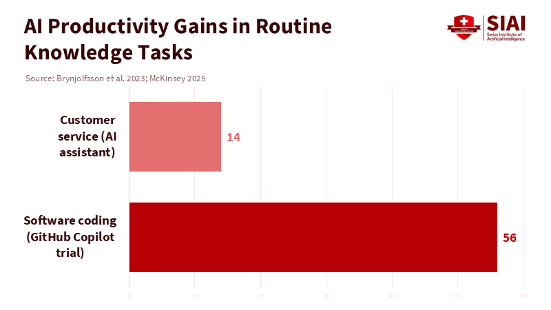 Across various fields, evidence is coming together. When a task's route is clear and documented, AI systems speed up processes and reduce variability. In controlled experiments, developers using an AI pair programmer completed standard coding tasks about 56 percent faster. This result has been replicated in further studies. Customer service agents using a conversational assistant were 14 percent more productive, with greater gains for novices—significant for education systems that want to help lower performers. These findings reflect what happens when patterns are recognizable and "next steps" can be predicted from a rich history of similar tasks. In mathematics, neuro-symbolic systems have reached a significant milestone. AlphaGeometry solved 25 of 30 Olympiad-level geometry problems within standard time limits, nearing the performance of a human gold medalist, and newer systems have formalized proofs more extensively. This is what we should expect when problem areas can be navigated through guided searches of known tactics, supported by larger datasets of worked examples and verified arguments.