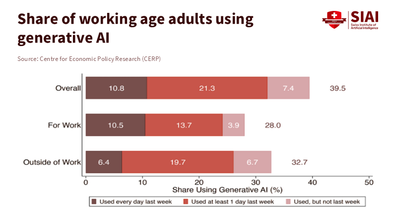 The extent of adoption is another barrier. U.S. survey data indicate that generative AI is spreading quickly overall. Still, only a portion of workers use it regularly for their jobs. One national study found that 23% of employed adults used it for work at least once in the previous week. OpenAI's analysis suggests that about 30% of all ChatGPT usage is work-related, with the remainder being personal. In educational settings, this divide is evident as faculty and students test tools for minor tasks. At the same time, core course design and assessment remain unchanged. If only a minority use AI at work and even fewer engage deeply, system-wide productivity barely shifts. This isn't a failure of the technology; it signals that policy should focus on encouraging deeper use in the workflows that matter most for learning and development.