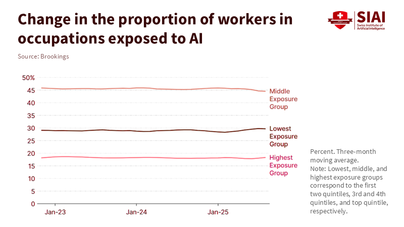 Let's start with a straightforward fact. U.S. labor productivity increased by 2.3% in 2024. This improvement comes after several years of weakness, with retail rising by 4.6% and wholesale by 1.8%. However, the feared rise in unemployment linked to generative AI has not materialized. Recent evidence supports this. A joint analysis by the Yale Budget Lab and Brookings, released this week, finds no significant overall impact of AI on jobs since the debut of ChatGPT in 2022. The labor market appears stable rather than in crisis. AI is spreading, but the so-called "AI jobs apocalypse" has not arrived. This doesn't mean there is no risk. Exposure is high in wealthy economies, and AI labor displacement will likely increase as adoption continues. Currently, we are witnessing modest productivity gains in some sectors, a slow spread in others, and localized displacement. This pattern is familiar; we experienced it with computers. We must develop policies based on this pattern: prepare rather than panic, emphasizing the urgency of preparing for the potential labor displacement that AI may cause.