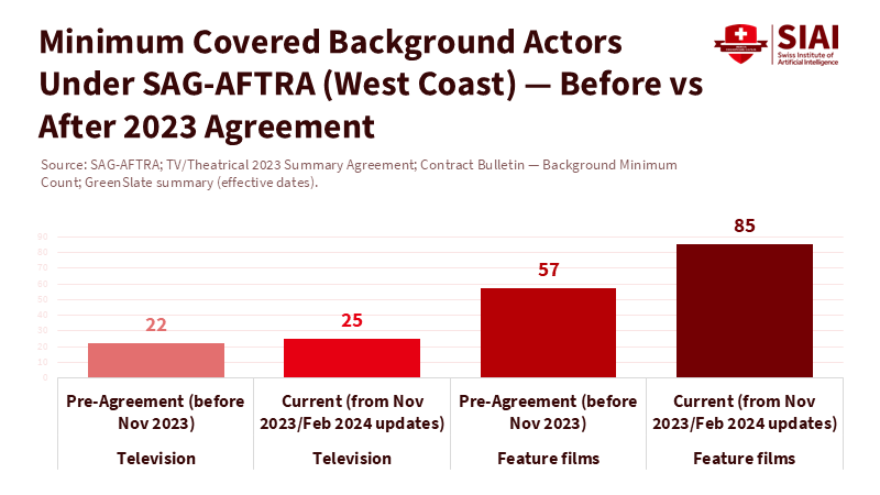 The rules are changing, too. The 2023 SAG-AFTRA TV/Theatrical agreement recognizes two essential categories for classrooms and on-set work: “digital replicas” of real performers and “synthetic performers” that look human but are not based on any specific person. The contract requires notice, consent, and payment when creating and reusing digital replicas, and it establishes limits on the number of human background actors that must be hired before using synthetic substitutes. Educators should teach these definitions and rights alongside acting technique or VFX. This knowledge is essential for employability.