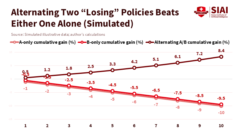 The third step is to safeguard variability in decision-making. Parrondo's paradox thrives because alternation helps avoid local traps. In policy, that means maintaining a mix of tactics even when one appears superior. If a single rule dominates every dashboard for six months, the system is likely overfitting. Always keeping at least one "loser" in the mix allows for flexibility and tests whether the environment has changed. This approach is not indecision; it is precaution.