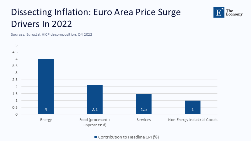 Energy and food prices accounted for the majority of the euro area’s inflation spike in 2022, highlighting the shock's supply-driven nature. The total contribution of these components aligns with the 9.2% headline CPI peak, underscoring the mismatch with traditional demand-management policies.