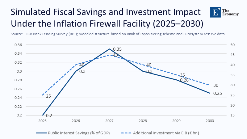 Quantitatively, this trinity is powerful. Even at the present 2.25 percent deposit rate, it would sterilize about €1.4 trillion of liquidity, trim aggregate bank net‑interest margins by eight basis points—still leaving them far above pre‑pandemic levels—and redirect roughly a quarter‑per‑cent of euro‑area GDP each year into infrastructure that lowers future price volatility. Over a five‑year horizon, the public interest savings exceed €150 billion, while the cumulative additional investment is approaching €180 billion. The Commission’s macro model indicates that such a profile raises potential output by over half a percentage point by 2030, enough to offset two‑thirds of the negative supply impact from the IEA’s high‑oil scenario. This potential for significant positive effects should inspire confidence in the proposed solution.