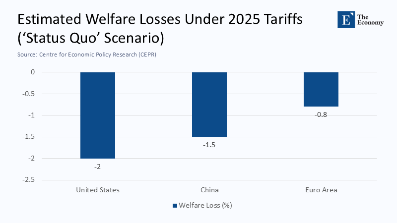 The CEPR simulation of the 2025 tariff package shows that the United States endures a welfare decline near ‑2 % under the still‑cushioned “status quo” path. China absorbs roughly ‑1.5 %, while the euro area loses less than ‑0.8 %.