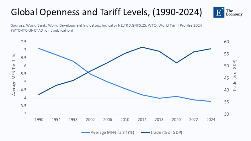 The birth of the World Trade Organization in 1995 codified the most ambitious exchange of tariff concessions in modern economic history. Average applied most-favoured-nation duties stood near seven per cent on the eve of the WTO’s launch; by 2014, they had fallen to roughly 3.8 per cent. Over that same span, the ratio of global trade in goods and services to world GDP climbed from thirty-eight to almost fifty-eight per cent. Each incremental cut in border taxes enlarged adequate market size, lengthened supply chains, and—most visibly in East Asia—pulled well over a billion people above the extreme-poverty threshold.