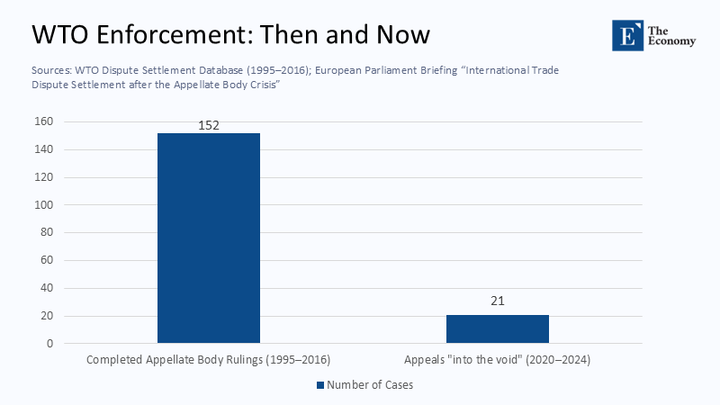 The WTO’s Appellate Body ensured that panel rulings carried real bite for two decades. It delivered 152 final decisions between 1995 and 2016. Since December 2019, no single appeal has reached judgment because the United States refuses to approve new judges. Without the threat of a binding legal decision, the deterrent power of litigation has evaporated. East Asia Forum captures the gravity neatly, warning that the global economy now stands “on the precipice of a world trade war,” its legal backstop hollowed out just when restraint is most needed.
