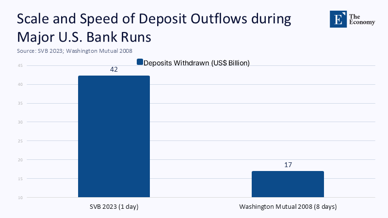 If intangible collateral shows pseudo-wealth at the asset side, Silicon Valley Bank’s 2023 collapse shows it on the liability side. The bank’s securities portfolio was underwater on a mark-to-market basis, but regulators note it remained solvent under hold-to-maturity accounting until the run began. What detonated liquidity was a narrative arbitrage executed at Twitter speed. Venture funds pinged founders in private channels; founders hit withdrawal buttons designed for frictionless UX. Customers yanked $42 billion—24 percent of deposits in ten hours—obliterating every liquidity buffer. The California DFPI filing confirms $42 billion on 9 March 2023. For comparison, Washington Mutual lost $16.7 billion over eight business days in 2008 before its failure.