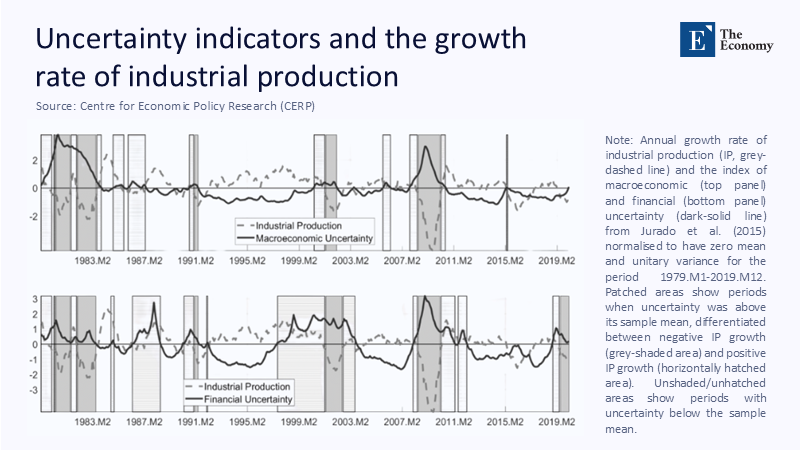 A modern illustration emerges from the post-pandemic recovery. According to the updated Ludvigson-Ng database, macro uncertainty fell 2.4 % in the first half of 2024 while financial uncertainty rose 7.3 %. Yet industrial production in advanced economies accelerated, precisely the outcome predicted by the disagreement mechanism: households diverged over inflation versus growth risks, sustaining both precautionary saving (saving for potential future risks) and selective consumption (choosing to spend on specific goods or services). When applied to policy, this disagreement mechanism can help maintain a balance between saving and spending, thereby sustaining economic activity.