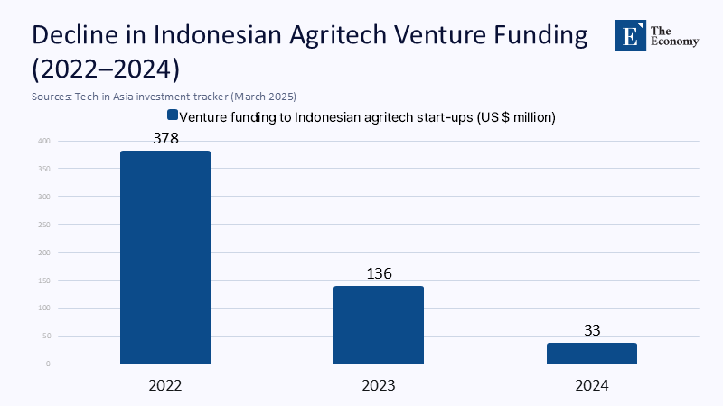 Money is not the only missing input; brains are scarcer still. The inaugural ASEAN Digital Integration Index scores the region just 48 out of 100 on its Digital Skills & Talent pillar—barely half of the benchmark level ASEAN says it needs to support deep digital trade. This 'dual throttle on ambition' refers to the twin challenges of attracting both talent and capital to the agritech sector in Southeast Asia. Venture investors are already voting with their wallets. Agritech funding in Indonesia, the bellwether market, cratered from US$ $377.6 million in 2022 to US$ $135.6 million in 2023, then collapsed to US$ $33.2 million in 2024 after scandals at flagship startups.