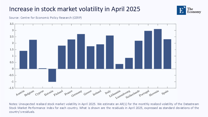 The most intuitive snapshot of this shock‑sharing capacity lies in stock‑market data. Figure 1 tracks the unexpected realized volatility of Datastream's stock‑performance indices across seventeen euro members in April 2025, plotted in units of each country's historical residual standard deviations. Notice the spread: Estonia's reading sinks modestly below zero, and Portugal peaks above three. Yet the euro‑wide VSTOXX index added less than half a volatility point over the same window, while the U.S. VIX briefly spiked past 25. The scatter betrays a family resemblance: national vol increases are uncorrelated with the union aggregate, implying that shocks were overwhelmingly local but not systemic.