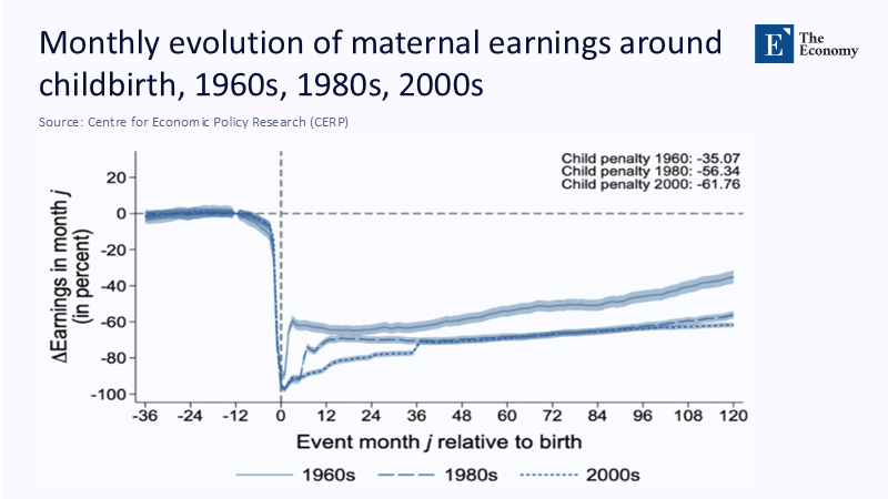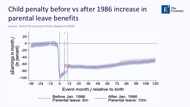 History warns that a duration without adequate pay fails. West Germany lengthened paid leave from six to ten months in 1986; a decade later, the average mother was still 57% below her no-child counterfactual. Figure 2 plots the pre- and post-reform trajectories: the blue line recovers marginally faster in months 6–12 then converges with the red control path. More months at half pay shift costs from the family to the state, but leave the long-range penalty intact.