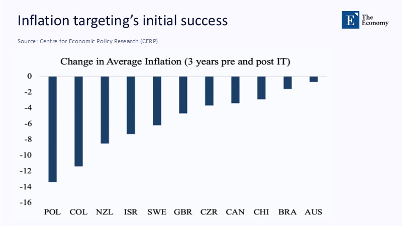 Figure 1 distills the first wave of inflation-target arrivals: within three years of adopting explicit targets, pioneers such as Poland, Colombia, and New Zealand shaved six to fourteen percentage points off their average inflation rates. The histogram, stark in its negative bars, makes it easy to see why the early 1990s were dubbed “the credibility bonus decade.”
