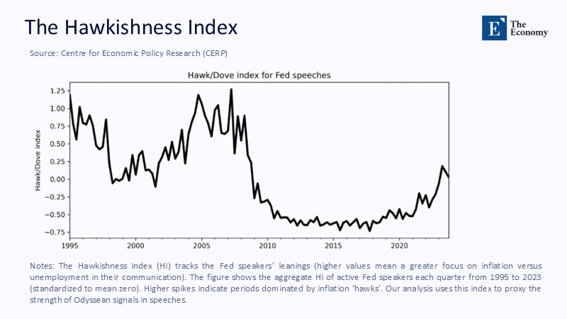 A second lens clarifies the residue of confusion. Figure 2 presents a Hawkishness Index (HI) that scores each Fed communication on a hawk-to-dove spectrum. The late 1990s were hawkish, reflecting pre-dot-com overheating; the 2010s dipped into dovish territory amid secular stagnation; and the last three years have seen a renewed hawkish ascent as policymakers fought the post-pandemic price surge. This index is crucial as it measures the Fed's stance on inflation and interest rates, directly influencing the public's perception of the economy and financial decisions.