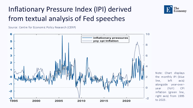 Figure 1 situates the communication problem in the Fed's own words. The blue line plots an Inflationary Pressure Index (IPI) extracted from every public Fed speech since 1995; the grey line is the actual year-over-year CPI. Apart from the post-dot-com disinflation and the 2009 financial crisis, Fed rhetoric has shadowed price reality with striking synchronicity, peaking in 2005, dipping during the Great Recession, and spiking again in 2021-22.
