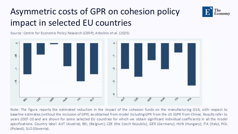 One empirical jolt should unsettle anyone convinced that equal money ensures equal European outcomes. When a standard geopolitical risk shock hits, the industrial growth payoff from Structural and Cohesion Funds shrinks by almost one-third on average, yet the damage swings from barely noticeable in Germany to economically traumatic in Poland and Italy. That spread, revealed by fresh panel estimates from Arbolino et al. (2025), lays bare a truth Brussels often downplays—policy written for a "continent-state" must land in twenty-seven sovereign settings, each with its politics, administrative bandwidth, and exposure to global turmoil. This underscores the need for differentiated frameworks that adapt to the diverse regional needs.