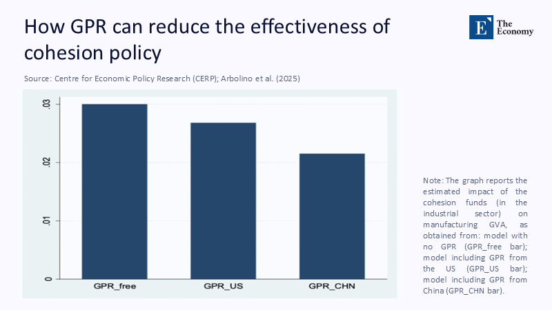 The CEPR team injected a trade-weighted geopolitical-risk index, which measures the potential impact of geopolitical events on trade, into a continent-wide production function and found that each spike in global tension clips the grant-to-growth multiplier from 0.29 to 0.22, a fall of 27%. When the shock emanates specifically from Washington, Italy's manufacturing value added loses 1.5 percentage points of lift; when the tremor originates in Beijing, Poland forfeits 3.5 points. These numbers animate Figure 1, where the first bar shows the baseline multiplier in tranquil times, the second captures the loss under U.S. risk, and the third under Chinese risk. The takeaway for policymakers is brutal in its simplicity: every time the world turns anxious, Brussels has to spend more merely to stand still, yet the bill it faces is wildly uneven across the map.