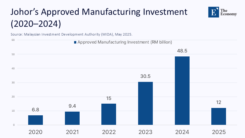 Multiply that by Malaysia's manufacturing investment pipeline—Johor alone captured RM48.5 billion in approved projects in 2024, third nationwide—and the upside compounds. Cheap land and Singaporean logistics equals a hybrid cost curve that neither jurisdiction can assemble alone.