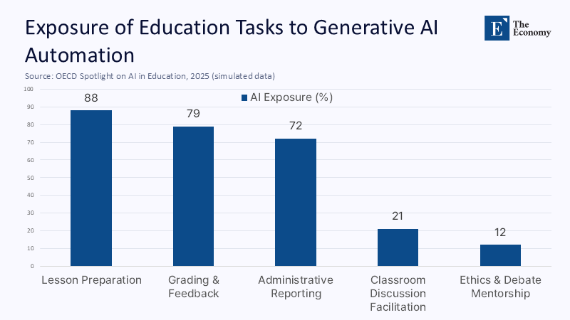 Global labor economists now put numbers to that collapse. A May 2025 International Labour Organization index finds that one in four jobs worldwide is “highly exposed” to generative AI, with clerical and routine language work at the epicenter. Education—long considered sheltered from automation because “every class needs a teacher”—shares the same risk profile as clerical work once its constituent tasks are disaggregated. The ILO’s refined task‑level analysis shows that 65% of “teaching associate professional” activities score above the critical exposure threshold. At the district level, the budget signals arrive even faster: early pilots in Colorado and Queensland cut per‑pupil assessment costs by 38% after switching low‑stakes grading to language models, freeing funds that boards quietly redirected to other line items rather than to additional mentoring time.