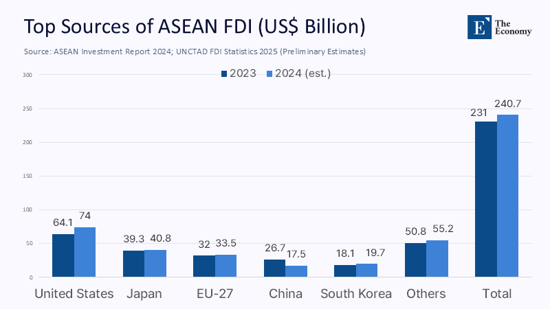 Hedging once implied hesitant non-alignment; today, it resembles portfolio theory writ large. ASEAN now treats geopolitical risk like investors treat market volatility—by diversifying across time horizons, asset classes, and counterparties. The numbers are telling. Foreign direct investment inflows reached a record US$234 billion in 2023 and are on pace for a further rise in 2024 despite a 1.8% slide in global FDI; critically, the United States displaced China as the single-largest source of those inflows, delivering US$74 billion, or 32% of the total, while China fell to fourth place with a 7.5% share. That redistribution was not accidental; it reflects conscious and meticulous policy tweaks—from negative-list investment schedules to expedited golden visas—that widen the funnel for capital not tied to one hegemon. In parallel, intra-ASEAN trade reclaimed the top slot at 21.5% of total merchandise exchange, edging out China’s 19.8% share for the first time since 2019. In other words, the bloc is insulating itself through redundancy, much like a supply-chain manager who refuses to depend on a single factory in a flood-prone valley.