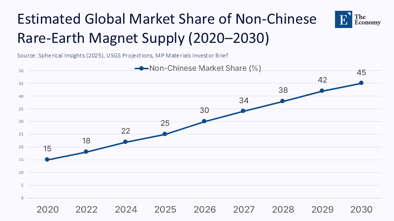 Outside China, the global supply chain is adapting from concept to concrete. Australia's Lynas, already suitable for 6% of global oxide output, will add 5,000 tonnes of magnet-grade NdPr annually from its Texas refinery in early 2026, financed under US Defence Production Act grants. MP Materials has commenced pilot batches of sintered magnets in Fort Worth and targets commercial deliveries before year-end under a US Navy offtake. New ventures in Vietnam, Canada, and India could lift non-Chinese separated-oxide capacity toward 45% of global demand by 2030. Monopoly shares may survive on paper, but once buyers hold a credible alternative—even a pricier one—the marginal leverage of the incumbent supplier collapses faster than its market share.