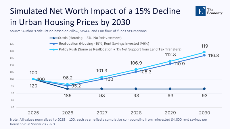 Take a baseline in which remote work plateaus at 35% of paid days by 2030—only six points above today’s reading, but still a quantum leap from 2019. Assume inner-metro rents fall another 10% in real terms, feeding a 15% nominal slide in home values through standard price elasticities. Middle-quintile households, 60% in housing, give up nine net worth points. Now run two variants. In “Reallocation,” half of those households plow their $4,000 a year rent savings into S&P 500 index funds: at a 5% real return, the capital accumulation fully offsets the equity leak in six years, narrowing the net-worth Gini by nearly two percentage points. In “Stasis,” the savings go to consumption; wealth gaps widen because the one-percenters enjoy equity beta. Finally, in “Policy Push,” municipalities layer a land-value tax that recovers part of the windfall from zoning reform and finances broadband build-out in ex-urban counties; the net effect is a modest redistribution of capital gains toward newcomers while encouraging employers to hire nationwide. Even the pessimistic case diverges sharply from the CEPR snapshot of 2022, which recorded only marginal inequality changes because those data froze the frame before the rent gradient truly bent.