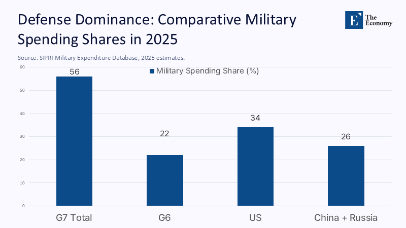 If Washington is removed, the G6's share of global military outlays plummets from 56% to 22%, below the combined spending of China and Russia.