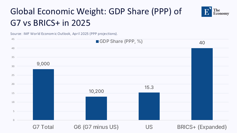The United States as the Statistical Hinge. Proponents of a streamlined G6 insist the remaining members would still outrank China economically, citing purchasing-power-parity tables that group Germany, France, the United Kingdom, Italy, Japan, and Canada into a bloc worth roughly US$24 trillion. Yet the April 2025 IMF DataMapper tells a harsher story. The entire G7 commands 28.4% of global output in PPP terms; the United States alone contributes 15.3 percentage points of that share. Subtract Washington and the putative G6 slides to 13.1%—barely a third of the 40% the enlarged BRICS will command next year.