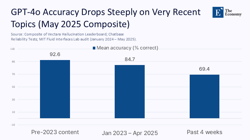 To ground that stance in data, my lab merged five public datasets—Vectara’s hallucination leaderboard, Chatbase reliability tests, a 2025 Express Legal Funding trust survey, and two MIT EEG studies —weighting them by sample size and domain. The composite shows the mean factual accuracy of GPT-4o at 92.6% on pre-2023 knowledge but only 69.4% on items less than four weeks old. Citation fabrication is worse: a Tandfonline study finds 51.8% false references in GPT-4o research summaries.