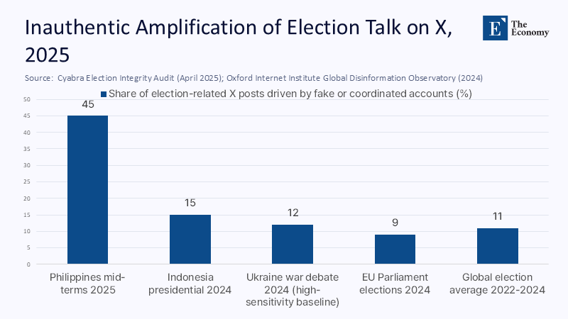In the final six weeks before the Philippines’ May 2025 mid-terms, forensic analysts uncovered a startling revelation: 45% of all election chatter on X (formerly Twitter) was driven by fake accounts boosting pro-Duterte talking points. This surge coincided with a record 82% voter turnout but also with polls showing that 85% of Filipinos feared online falsehoods more than inflation or crime. The urgency of the situation was further underscored by a viral deep-fake video of Senator Ronald “Bato” dela Rosa pledging fealty to the International Criminal Court, which drew two million views in under twenty-four hours before fact-checkers could flag it. Meanwhile, the World Economic Forum’s 2025 Global Risks Report again ranked misinformation as the planet’s most immediate threat, ahead of armed conflict and extreme weather. These numbers reveal a systemic market failure, not a series of isolated instances of deception. The need for policy to rebuild the civic information supply chain from platform code to classroom pedagogy is more pressing than ever, as democracy remains hostage to whoever writes the loudest script.