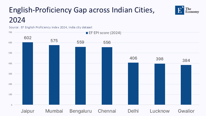 On the other side of the ledger, England retains outsized economic clout despite modest reach. The EF English Proficiency Index 2024 ranks India 69th out of 116 nations, with a score of 490—below the global mean and significantly behind regional peers, such as Vietnam—and an alarming 151-point gap between the highest-scoring city (Jaipur) and the average of the Hindi Belt. Our estimate, using EF micro-scores and state GER data, suggests that moving every state merely to "moderate proficiency" would require training at least 240,000 additional English teachers at a conservative ₹50,000 per trainee—₹12 billion before a single new classroom is built. Methodologically, we applied the Ministry of Education's 2023 teacher-training cost baseline (₹42,600) and added 15% for inflation and ed-tech modules.
