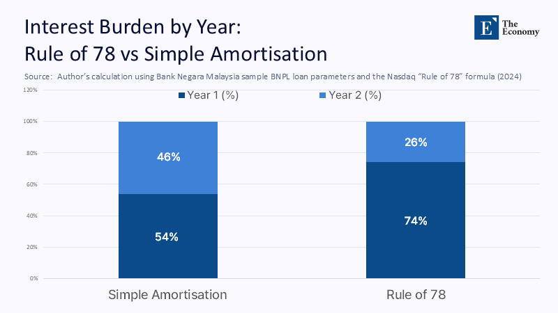 To ground the discussion, I replicated Bank Negara’s typical ticket scenario using two amortization methods. Assume an RM 1,000 BNPL purchase repayable over 24 months at a nominal 10% flat rate. Under simple amortization, a borrower pays a total interest of RM 100, with 54% of that cost falling in the first year. Under Rule 78, year-one interest balloons to 74%—an implicit 37% markup on the effective APR for anyone who settles early. My calculation weights each monthly interest slice by the sum-of-digits formula (n = 24; Σ 1‒24 = 300) and allocates total interest proportionally. The result mirrors Nasdaq’s illustrative U.S. figures, confirming the method’s burden is geography-agnostic.