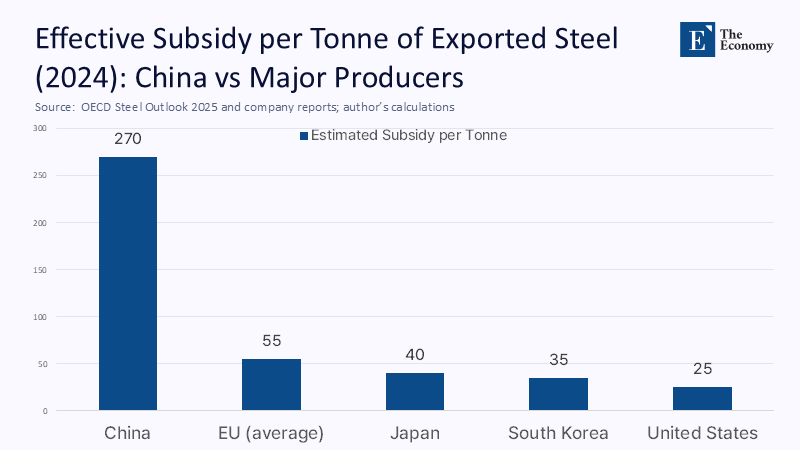 Despite persistent opacity in subsidy reporting, the contours of distortion are increasingly visible. OECD's Steel Outlook 2025 identifies state support to the 30 largest Chinese steelmakers in 2024 at roughly USD 32 billion, a blend of cash grants, VAT rebates, energy subsidies, and concessional loans. When compared with the 118 million tonnes of exported steel, this translates to an effective support rate of USD 270 per tonne.