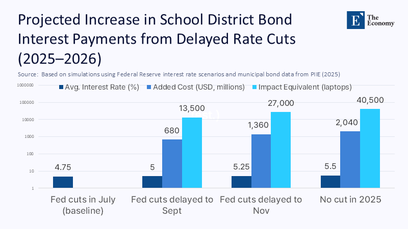 The Federal Reserve sits uneasily at the intersection of these pressures. Minutes from its June 18 meeting reveal internal debate over whether tariff-propelled goods inflation will persist long enough to derail planned rate cuts (Federal Reserve Board, 2025). For schools, the monetary stance is no academic footnote: 44% of districts issue variable-rate bonds for capital projects. Every 25-basis-point delay in easing adds roughly USD 17 million in interest obligations across the sector, according to municipal finance advisory data. While a quarter-point swing may seem abstract to households, for school boards, it determines whether aging HVAC systems are upgraded before winter.
