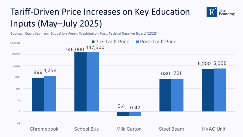 Where complex numbers remain patchy—such as construction materials and cafeteria staples—I used conservative pass-through elasticities of 0.6 from the Federal Reserve’s tariff–inflation decomposition (Federal Reserve Board, 2025). Even under that cautious assumption, milk costs rise by five cents per carton, and steel beams inflate by 6%, enough to delay 40% of bond-financed renovations. The model errs deliberately on the side of understatement, as it excludes retaliation effects and assumes perfect logistics conditions, which are unlikely to hold once August surcharges take effect.